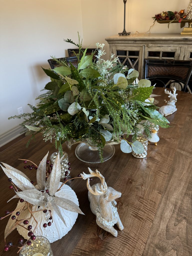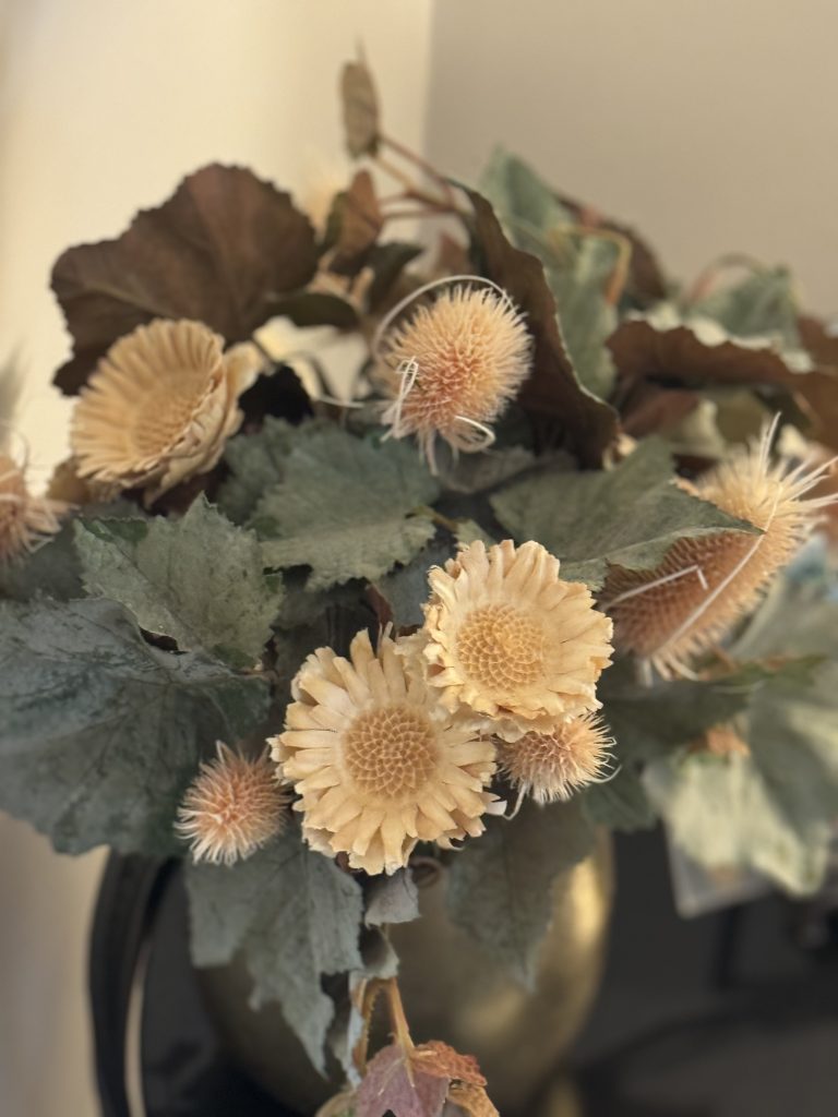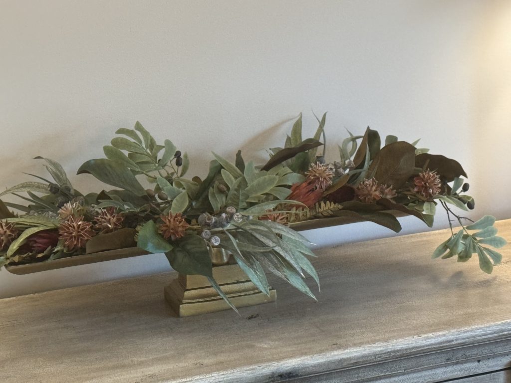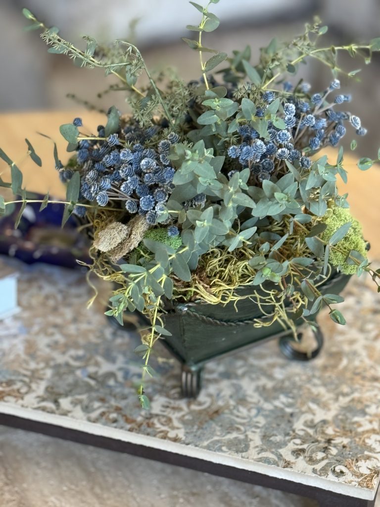 I am selective on the quality of dried and silk used. I usually keep a box of things in storage so I can change out easily in my home and I can get anyone started on a base to add and change through seasons in yours. Also I can arrange permanent pieces. Same hourly rate applies at $30 to $40 plus cost of materials.