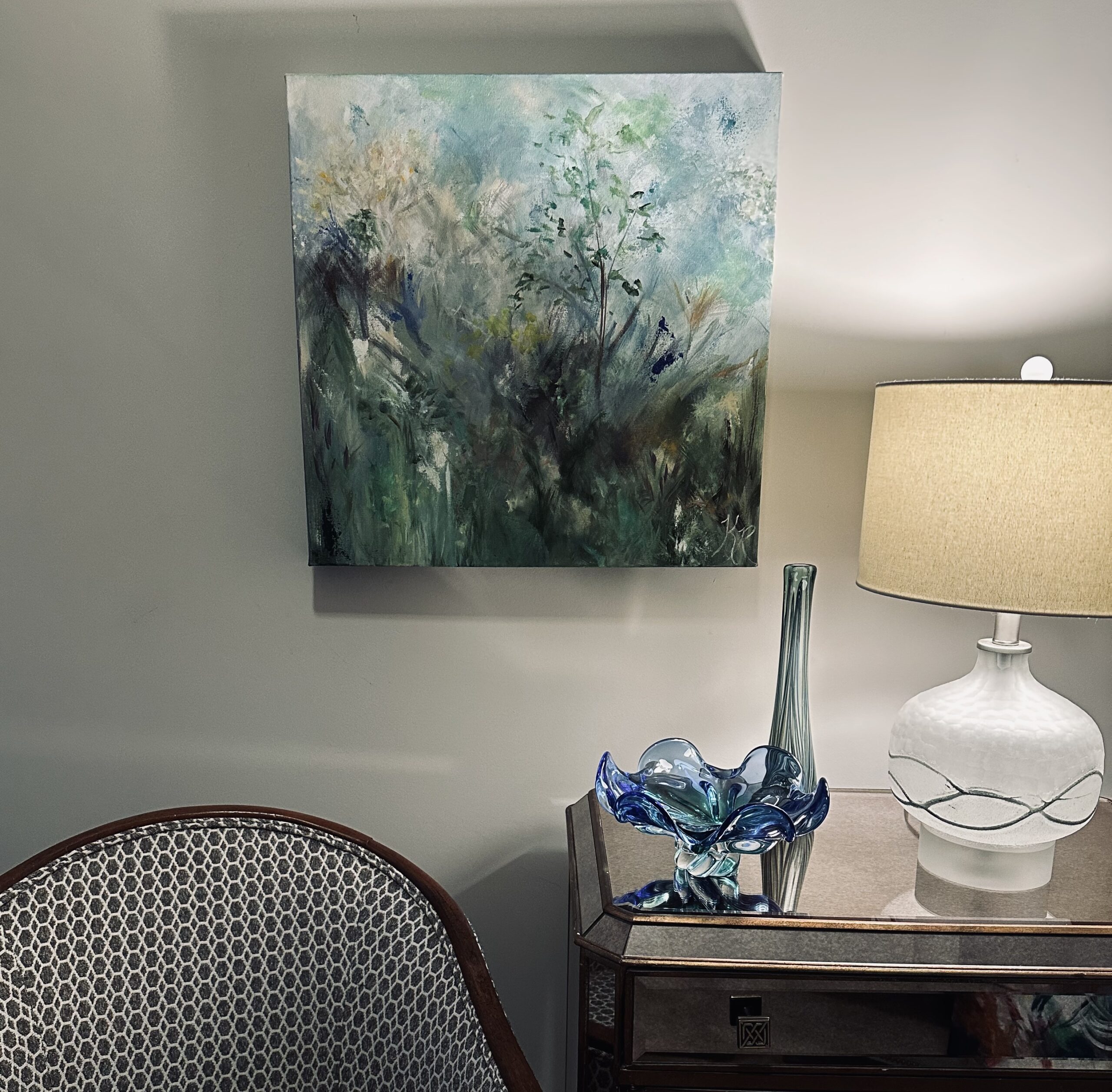 This fun piece with lots of movement was inspired by a view from my studio in early Spring after a rain shower. The sun peeping back through. “Paint what you see”, the words followed by impressionists kept flowing through my mind. The splash of vibrant blue can handle the same in decor when placing in your home.