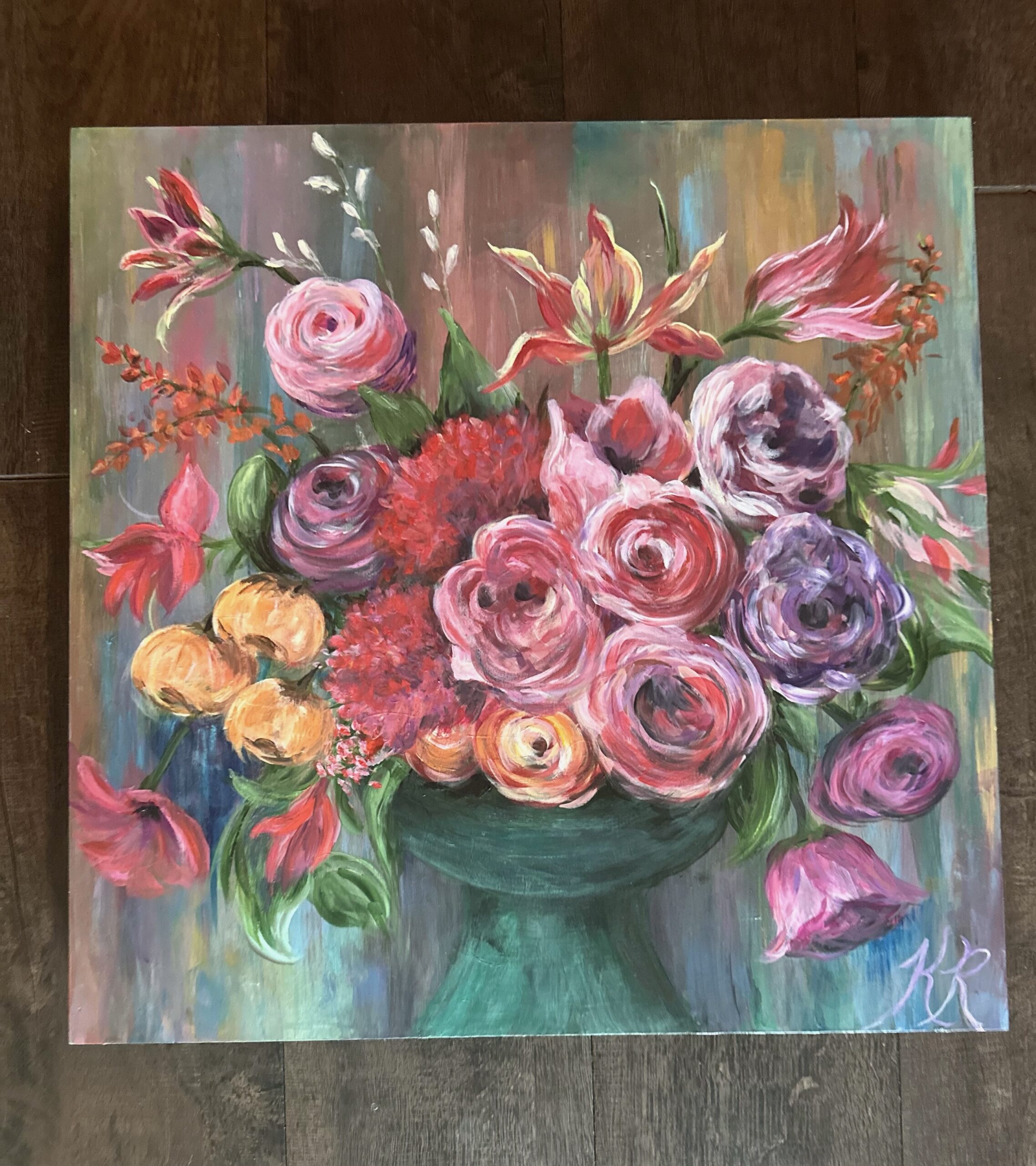 A lively colorful acrylic piece. I feel it is a good representation of my free style painting capturing value and movement. A little metallic in background. Fuchsia roses represent appreciation and gratitude.