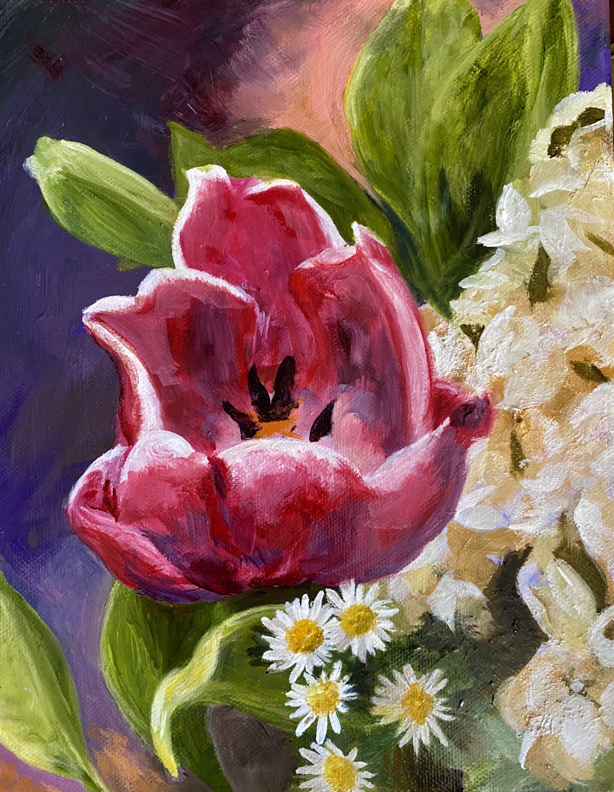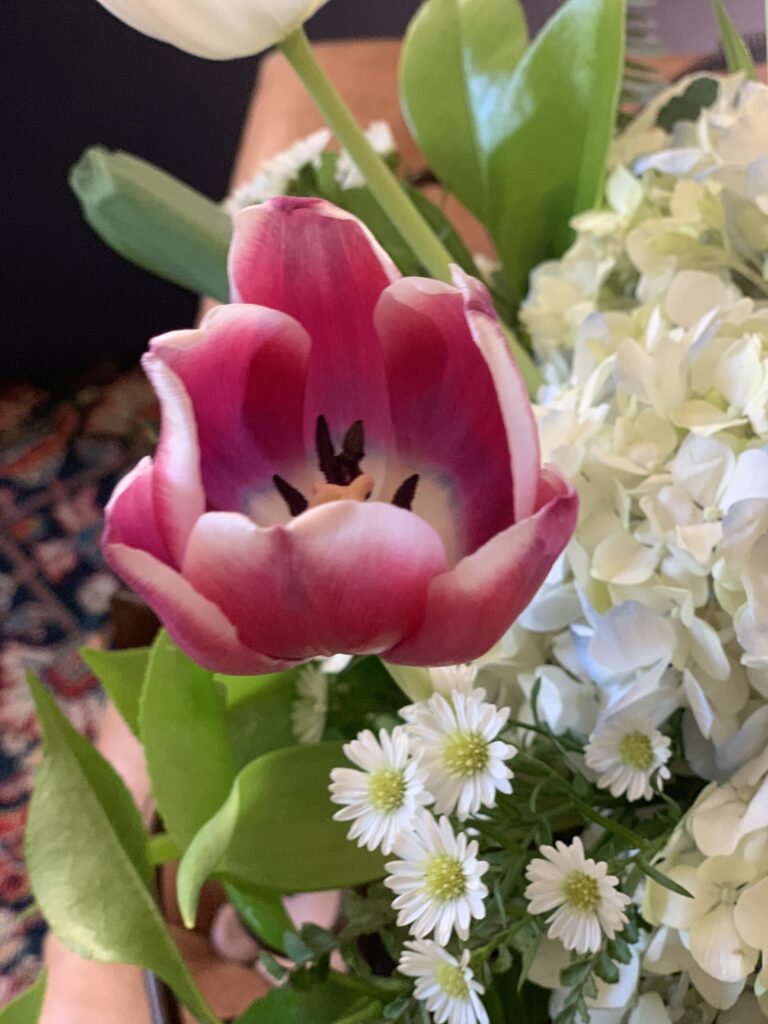The photo was taken from above this beautiful arrangement given to me to say thank you for friendship. The depth of the tulip truly makes the painting with the smaller white flowers adding to a wonderful placement of texture and color value. Then adding the silky softness of the white hydrangea really made this happen well.