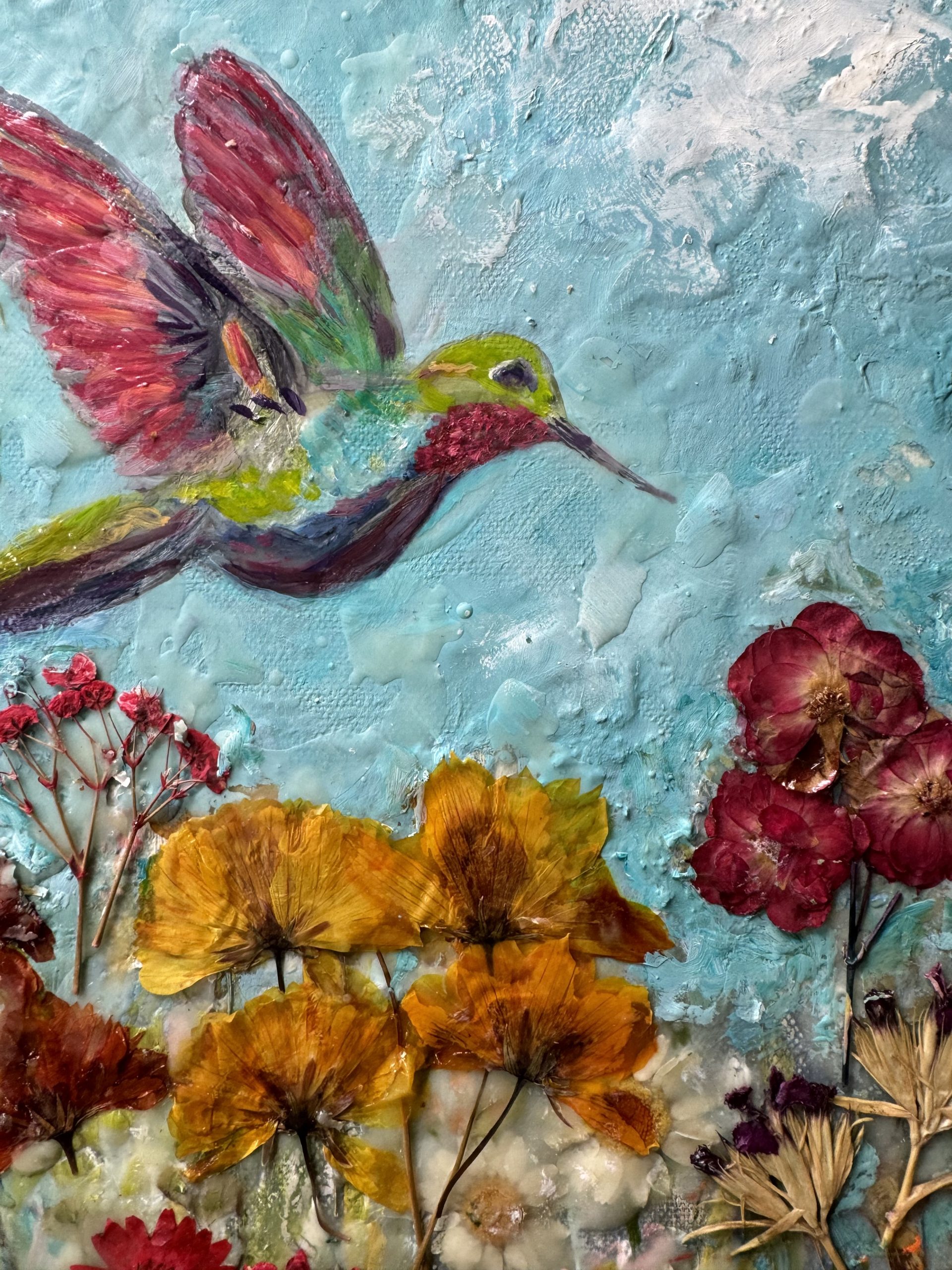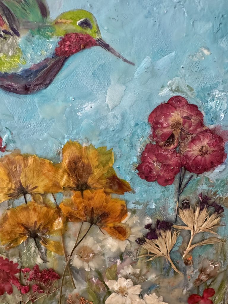 Mixed Media. Oils, Pressed Flowers and Beeswax on canvas.