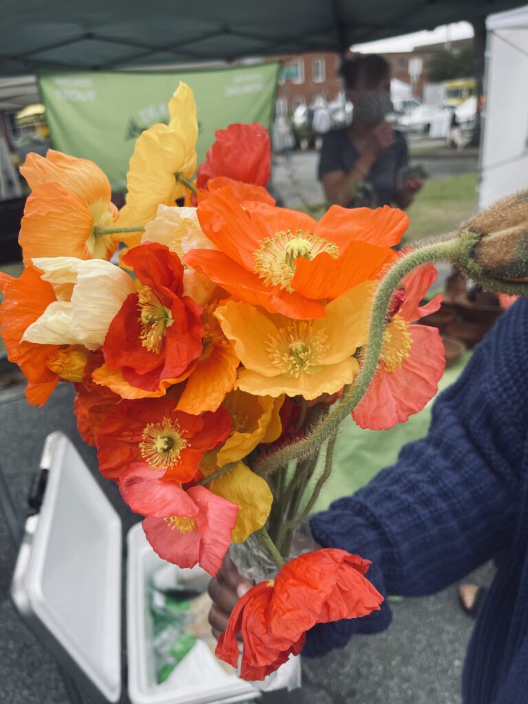 Visiting the Marietta Farmers Market off the square is a favorite pastime. There are several vendors making bouquets from the flowers they grew in their gardens so it’s an inspirational experience for me. A lady walking through had selected this bouquet and I asked if I could take a photograph. Poppies have many meanings through many cultures and Christianity.